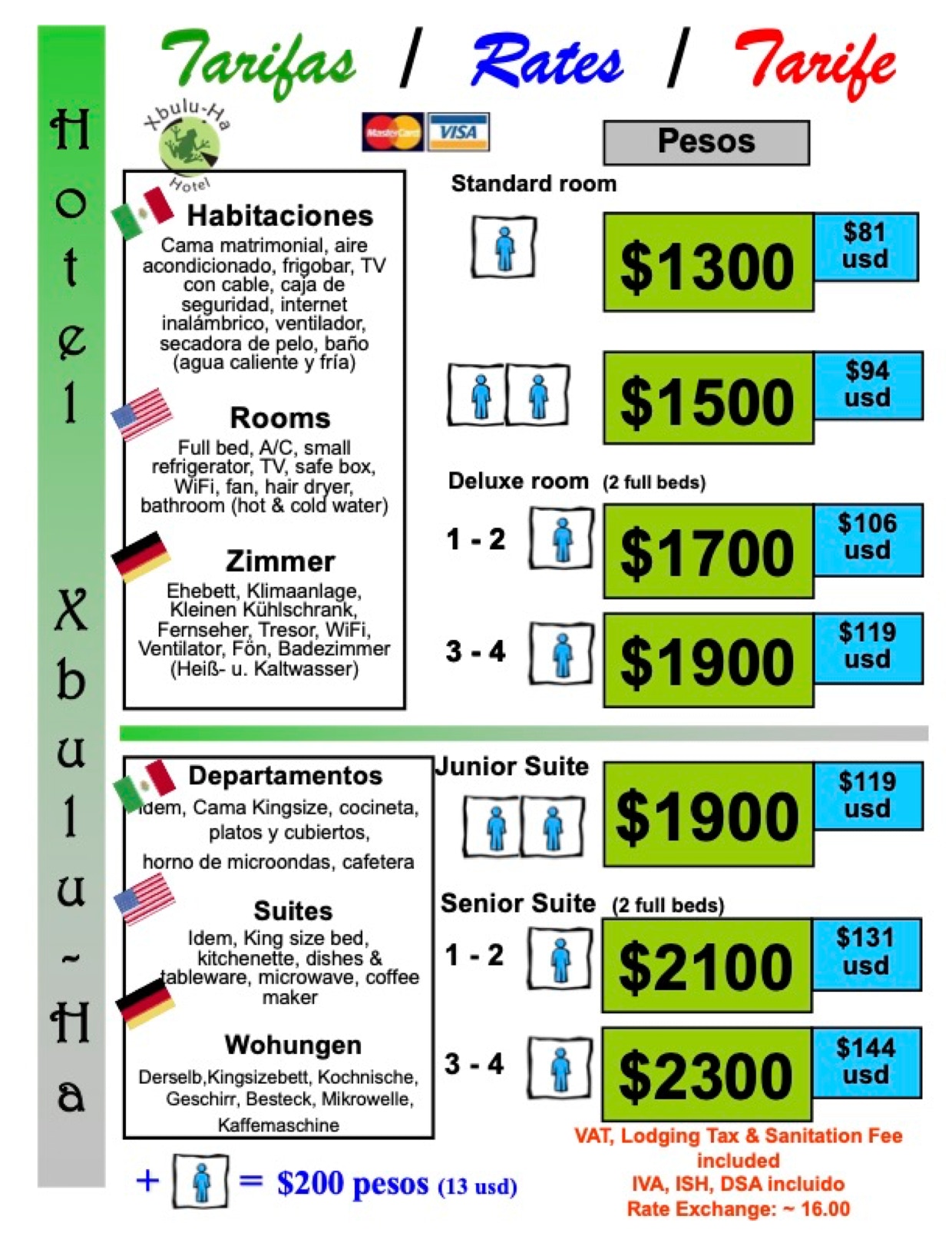 Las tarifas de las habitaciones son por noche. El IVA, ISH y DSA (derecho de saneamiento ambiental) ya están incluidos.